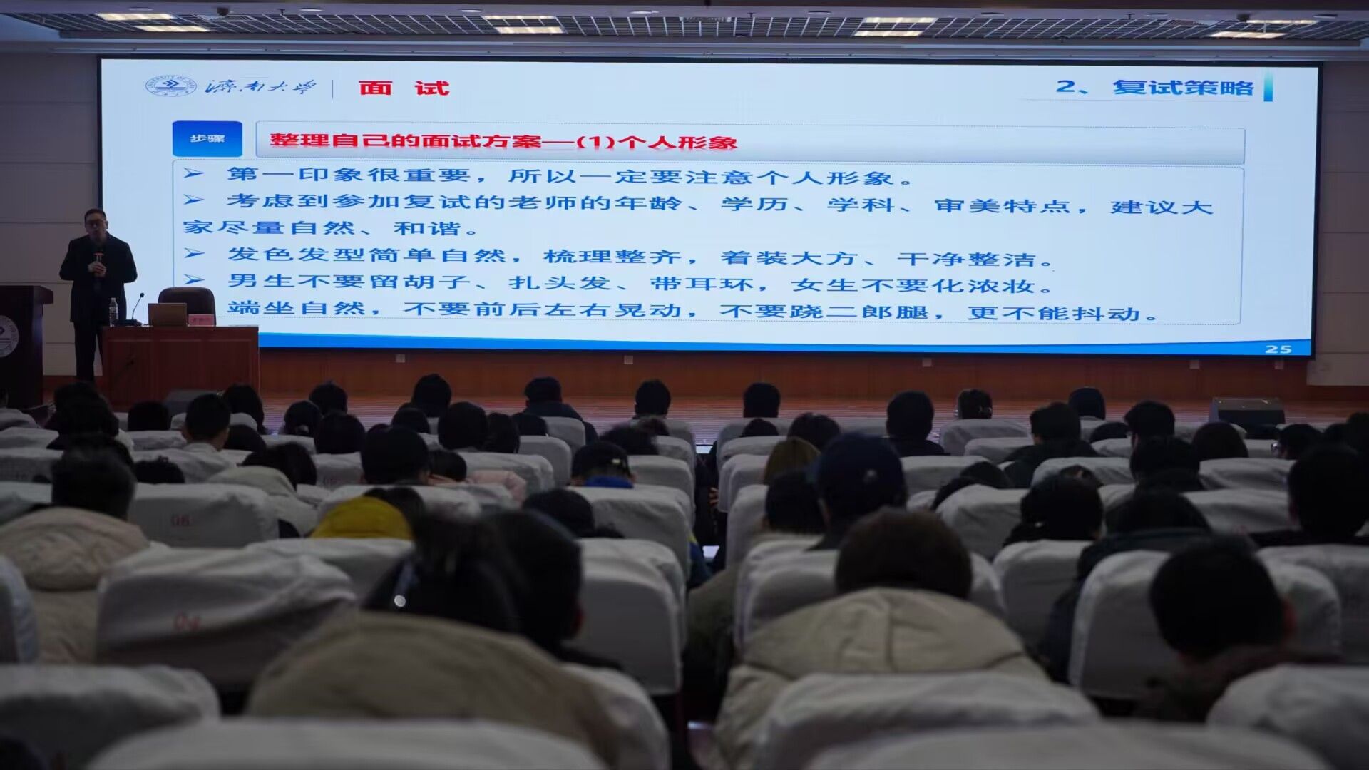 会上,李树人结合多年指导学生经验,围绕复试心态、复试策略等方面,为同学们系统梳理了复试备考技巧。他强调,平常心是应对复试的最佳心态,建议大家接纳自身焦虑、正视焦虑的普遍性,多做积极的自我暗示,多方搜集有效备考信息,为复试筑牢基础。随后,他详细讲解了联系导师、笔试、面试等关键环节及注意事项,建议同学们拓宽信息渠道、统筹复试调剂准备,遇到问题及时向辅导员、专业老师、朋辈学友咨询,珍惜机会、全力备战,取得佳绩。