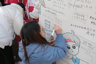 活动开始前,志愿者们按计划摆放好活动物品,布置好活动现场。一切准备就绪后,活动于11月13日上午十点正式开始。参与活动的同学陆续到达八食广场,为即将考研的学长学姐们送上自己的暖冬祝福。与此同时,部分考研学子也来到了活动现场,在准备好的横幅上签上自己的名字,并合影留念。同学们弯腰认真书写祝福的场景、广场帐篷边志愿者忙碌的身影,考研学子脸上洋溢的笑容,构成了冬日里温暖的一道风景。征集活动结束后,志愿者们整理好物品并合影留念。本次展示活动持续三天,活动期间志愿者们将写满祝福的展板搬至八食门口、图书馆、十教等地方妥当放置,并悬挂横幅,为考研学子送去最真挚的祝福与温暖的鼓励。11月15日,展示时间结束,志愿者们将展板与条幅收纳整齐,并将祝福语在线上进行展示,至此,本次活动圆满结束。