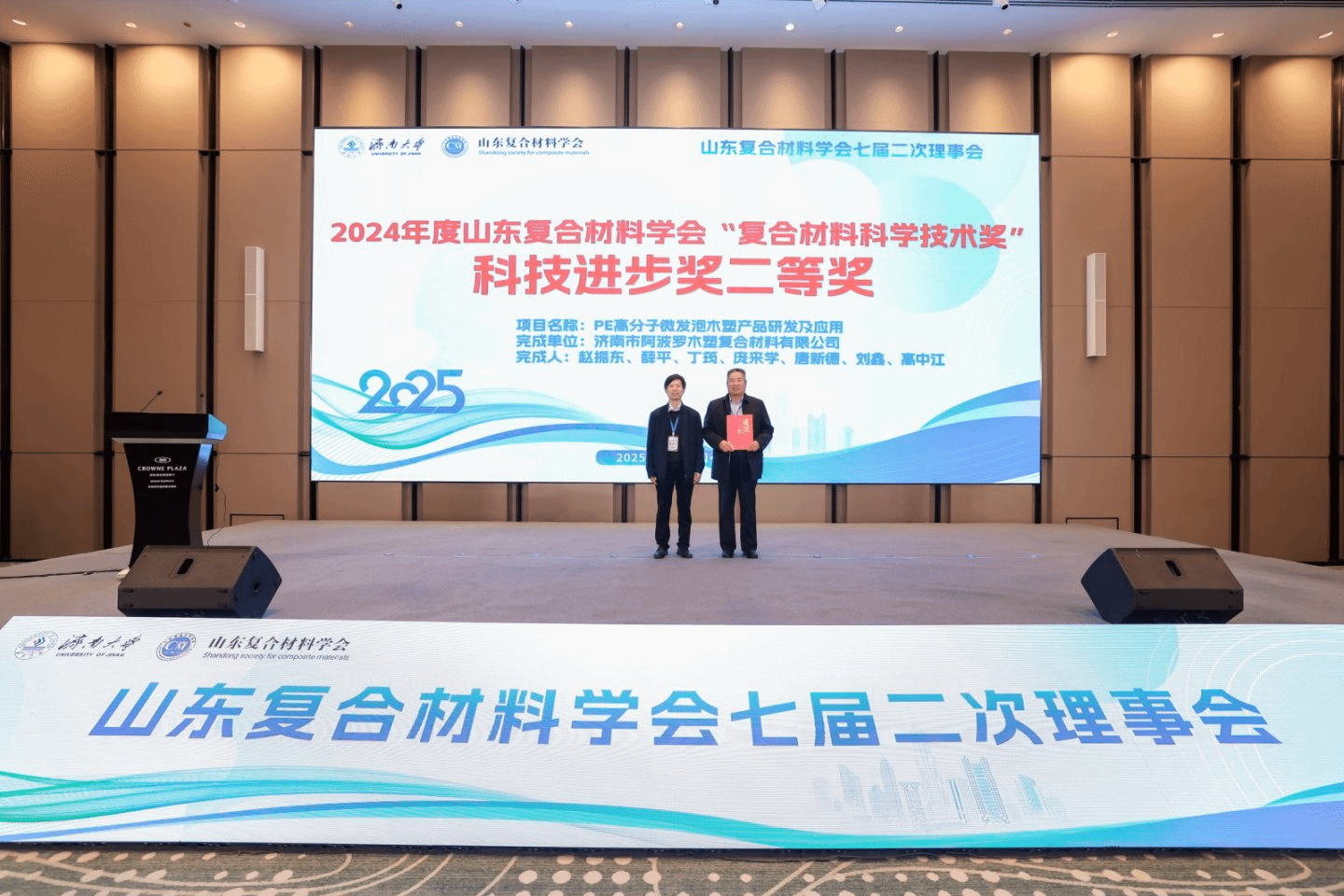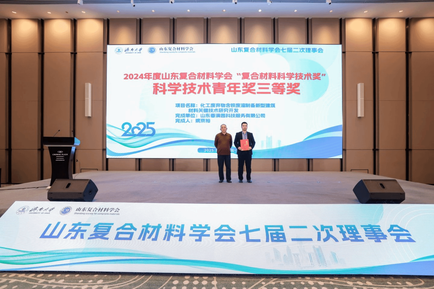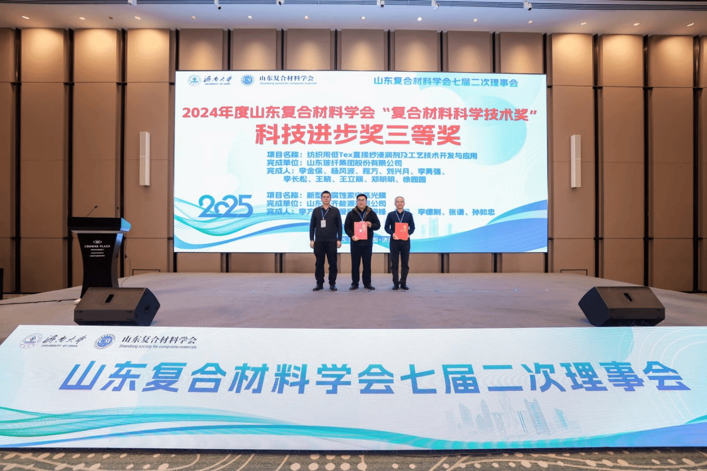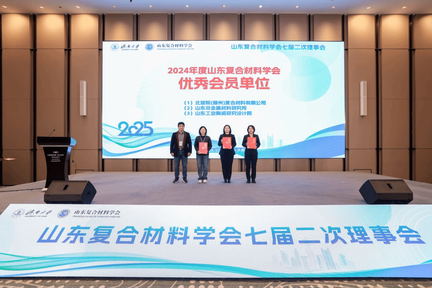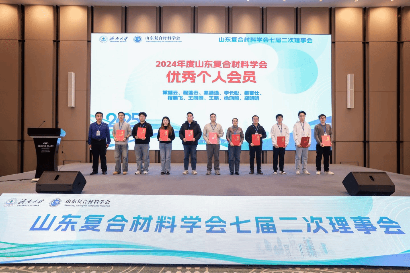 会议现场公布了山东复合材料学会2024年度学会优秀个人会员、优秀会员单位、优秀青年科技工作者、“复合材料科学技术奖”科学技术青年奖、科技进步奖等多个奖项名单。学会副理事长、山东格瑞德集团风电公司总经理吕玉清,学会副理事长、中国石油大学材料学院副院长鲁效庆,学会副理事长、威海光威复合材料股份有限公司总工程师林凤森,学会副理事长、山东鑫捷瑞复合材料科技有限公司总经理赵成波,学会副理事长、聊城大学材料学院院长滕谋勇,学会副理事长、北玻院(滕州)复合材料有限公司董事长张为军和学会副理事长、山东大学教授朱波分别为获奖单位和个人颁奖并合影留念。