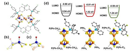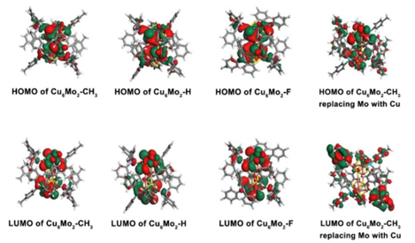 该研究工作通过在一价铜簇中引入[MoOS3]2-单元(增强团簇的稳定性和产氢活性)设计合成出含有不同取代基(-CH3、-H和-F)的系列铜-钼双金属团簇化合物Cu6Mo2-CH3/H/F,并将其作为光催化剂,实现了高活性和高稳定性的光催化产氢。研究表明通过金属簇外层配体上取代基的推拉电子效应,可以实现对铜-钼团簇HOMO和LUMO能级的精准调控。理论计算也表明[MoOS3]2-单元的引入可以增加产氢反应的活性位点,因此所设计合成的团簇催化剂表现出显著增强的光催化产氢活性。